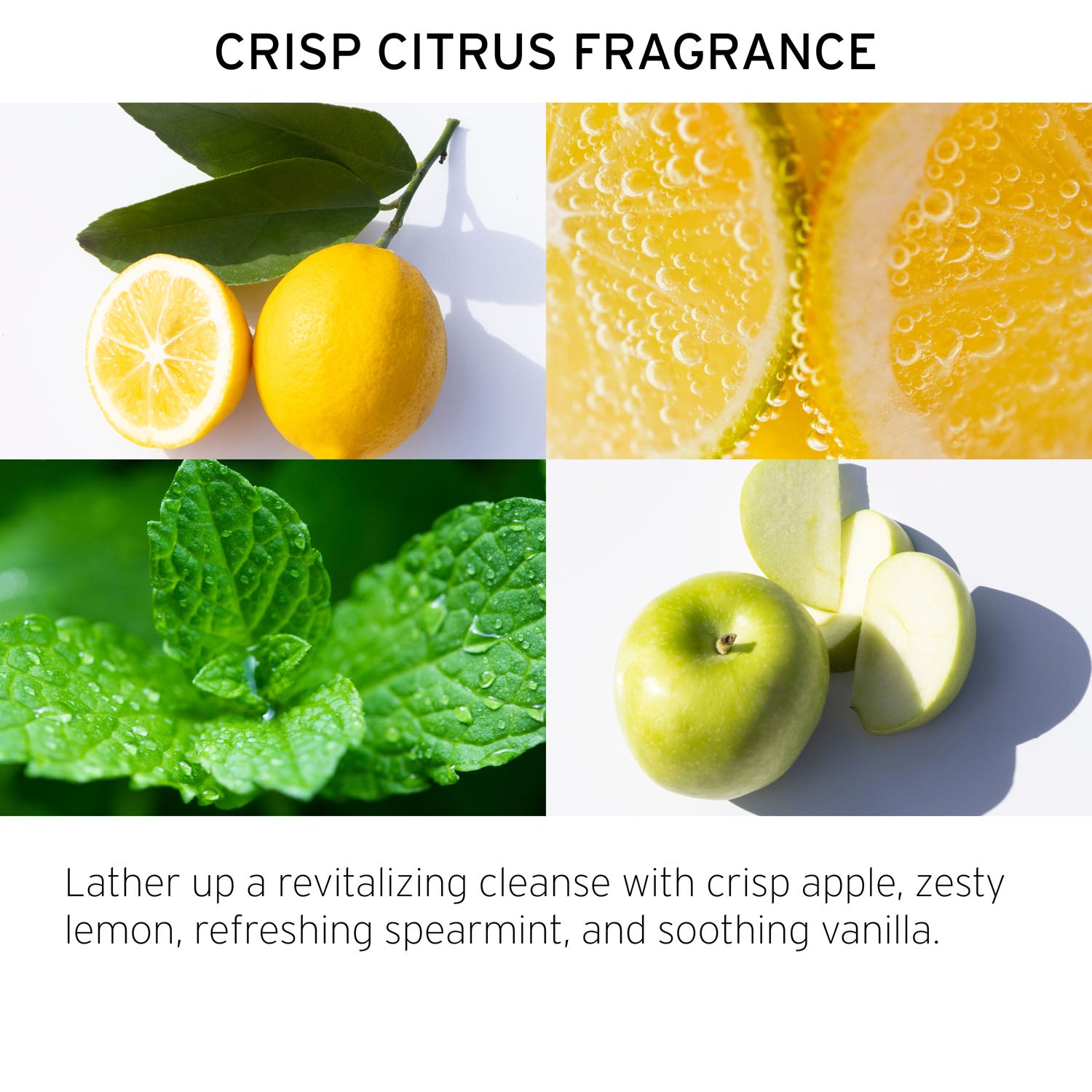 - Scent: an invigorating mix of green apple, juicy clean citrus, fresh spearmint, and creamy woods.